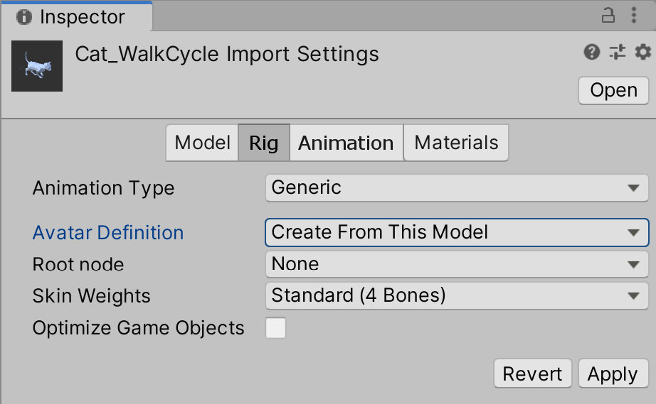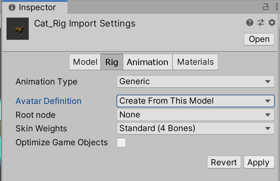 4. Ensure that the Avatar Definition is set to Create From This Model. This will tell Unity to look at our Cat_Rig for all rigging information.