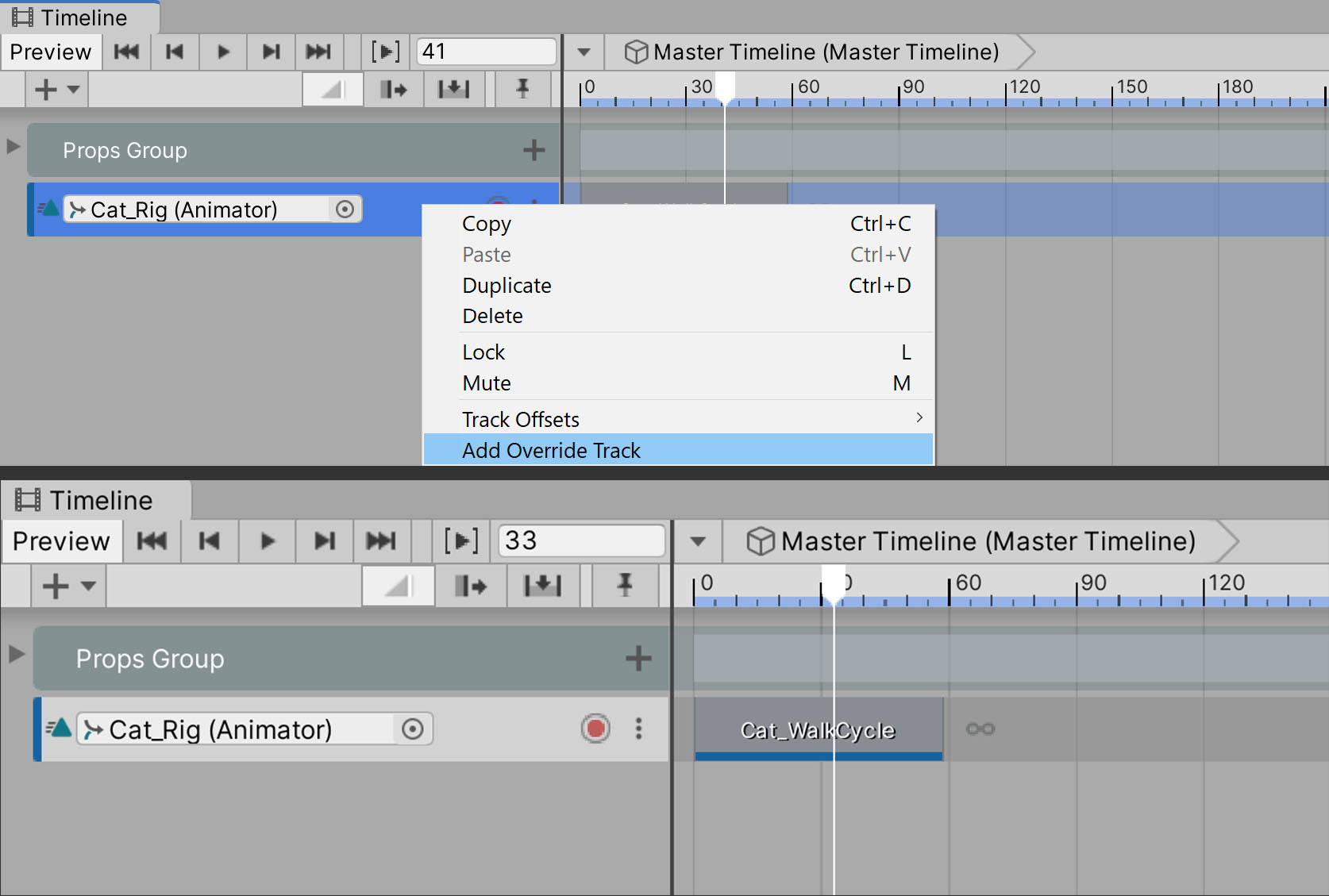 1. Right-click on the Animation Track for our Cat_Rig and choose Add Override Track.