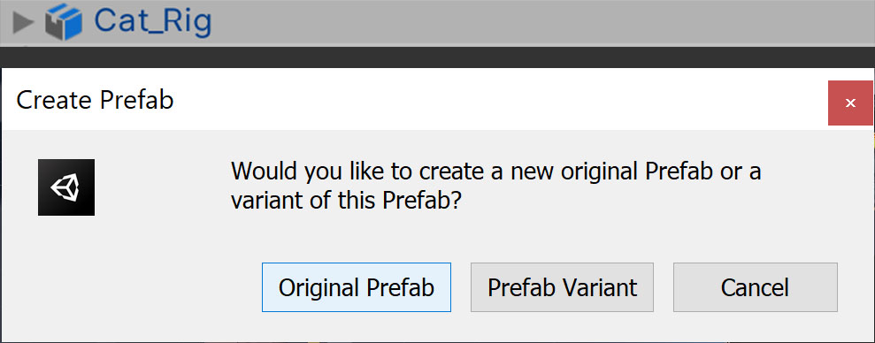 3. Unity will ask if you wish to create an Original Prefab or a Prefab Variant for the Cat. Click Original Prefab (Figure 02).