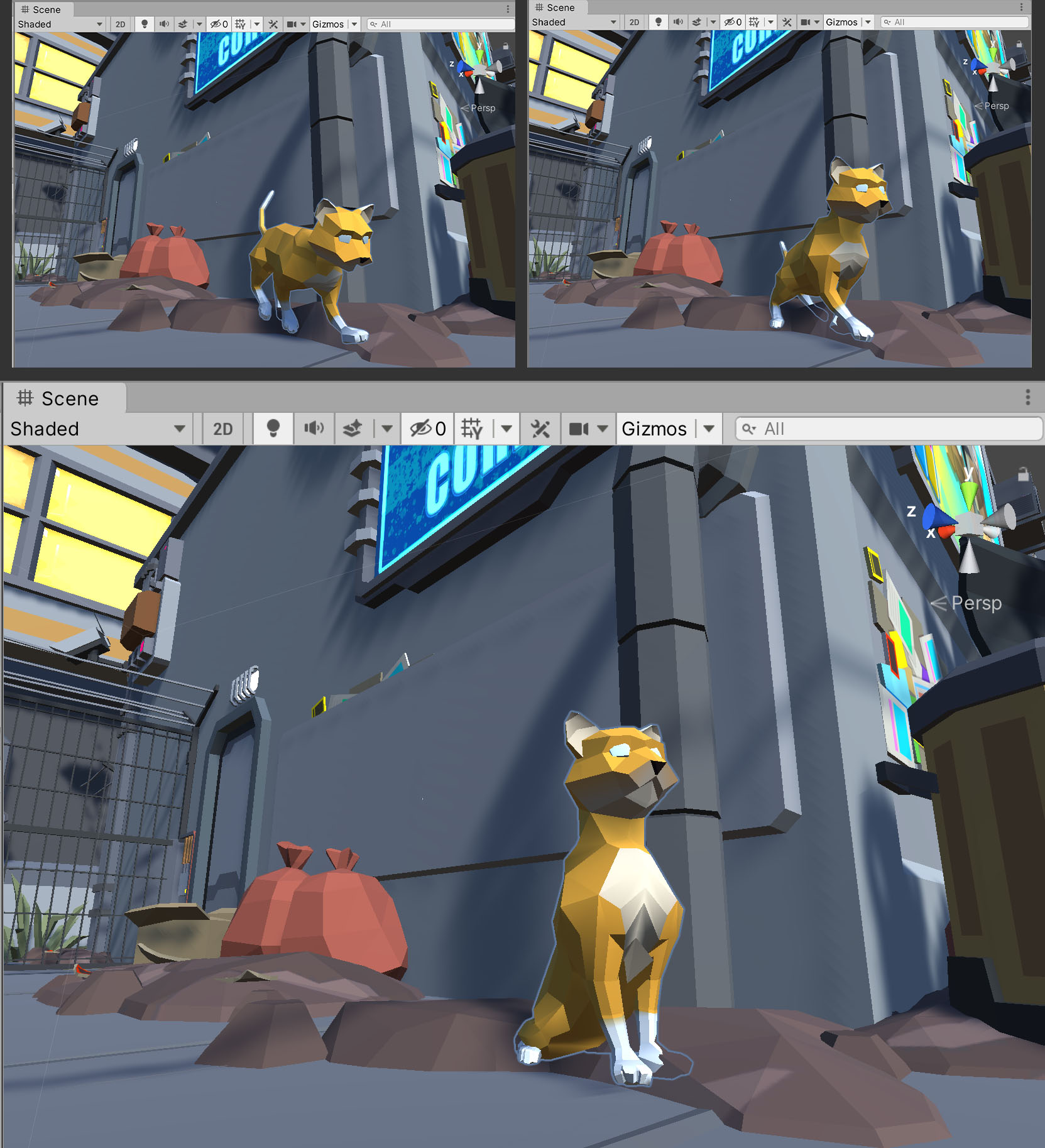 Generic characters aren’t at all “generic.” They actually require specialized rigs and animations that are specifically designed for their particular body shapes and structures. In this example, the stray cat has animations specific to its rig — the dog in our scene has a different skeleton setup than the cat, so we can’t use cat’s animations on it. . This also extends to similar characters. If two cats have different rigs, they can’t share the same animations. We’ll talk more about Humanoid rigs in Lesson 4.3.