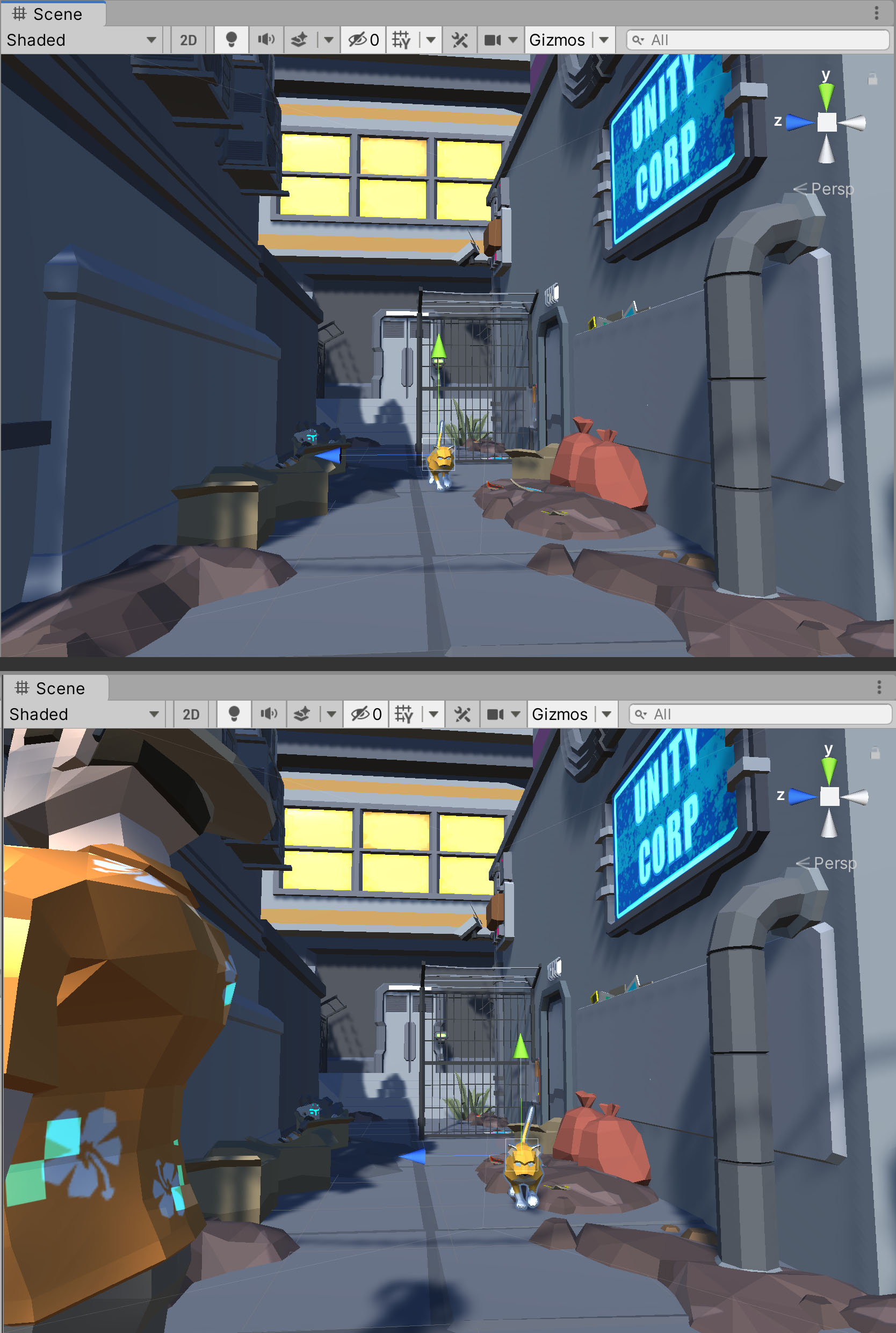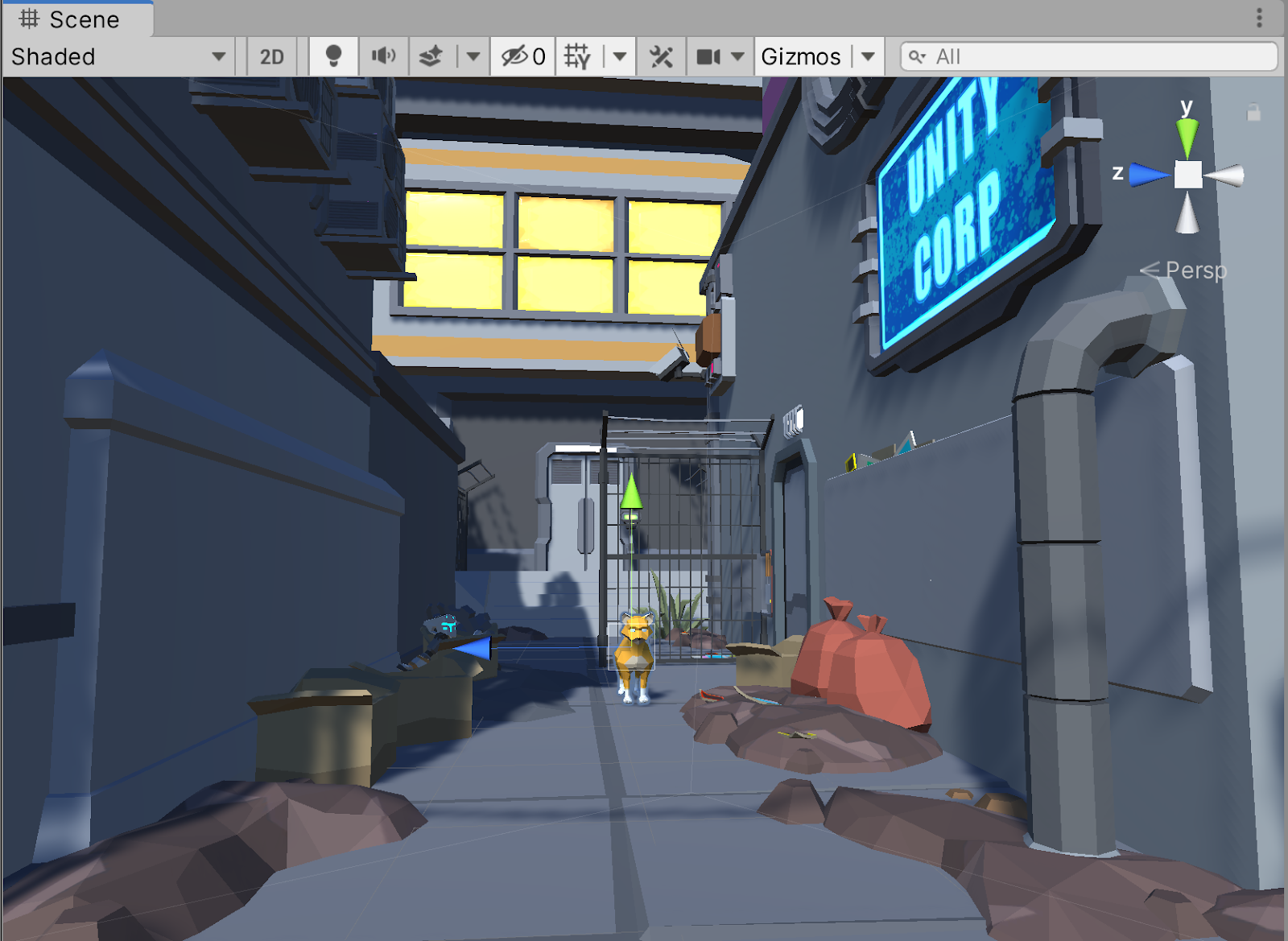 4. Select the Cat_Rig in the Scene Hierarchy, then position the cat in the alley behind the Unity Corp sign. (Figure 09).