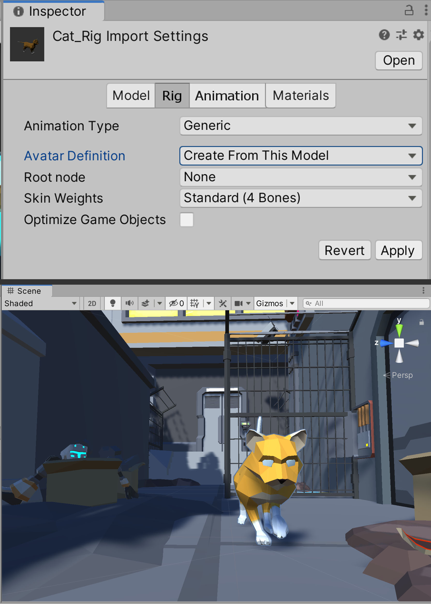 In our Scene is a stray cat. Let’s configure our cat so we can animate it. First, we need to configure its rig to tell Unity how we want to use it.