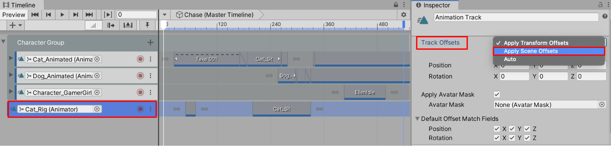 Please note, as you’re animating characters, if you experience a scenario where a character snaps or jumps to the center origin position (at the coordinates of X=0, Y=0, and Z=0) when an Animation Clip is added, first select the character’s track in the left column of the Timeline window, and then change the Track Offsets dropdown menu to Apply Scene Offsets in the Inspector (Figure 17). Remembering this important tip will save you from frustration when your character suddenly has a mind of its own!