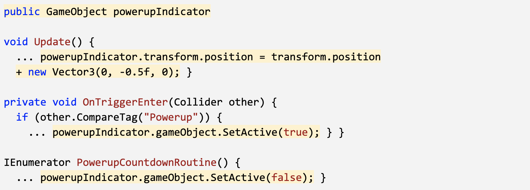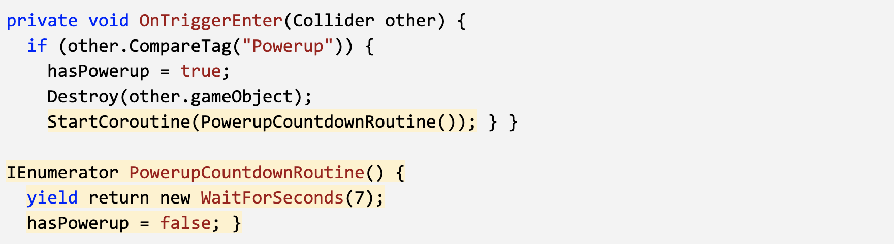 - Inside the PowerupCountdownRoutine, wait 7 seconds, then disable the powerup