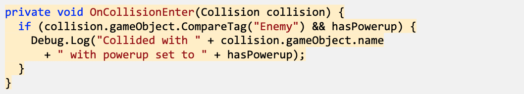 - Create the if-statement with the double-condition testing for enemy tag and hasPowerup boolean