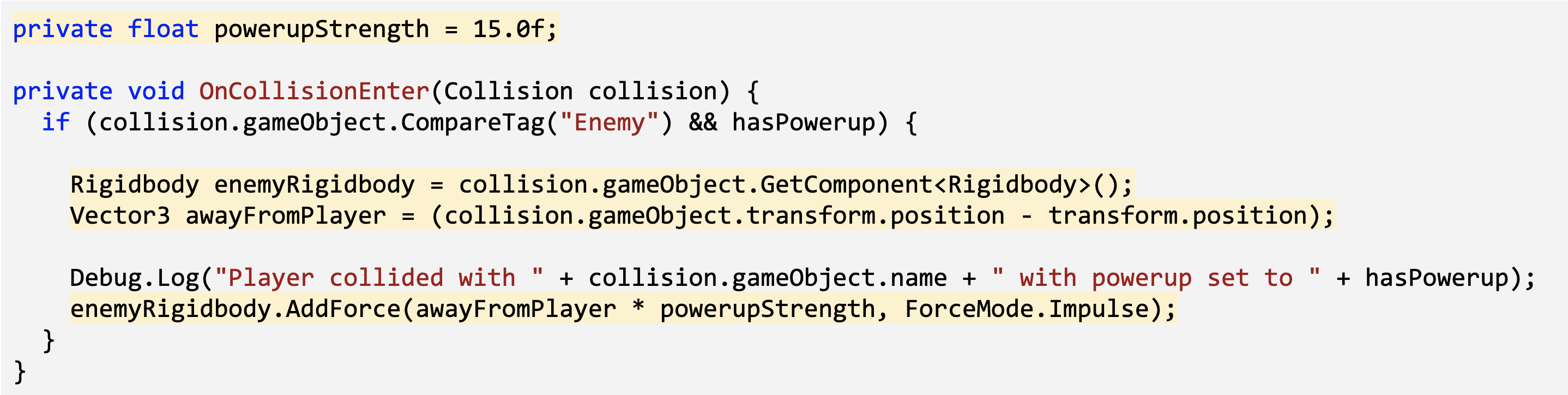 With the condition for the powerup set up perfectly, we are now ready to program the actual powerup ability: when the player collides with an enemy with the powerup, the enemy should go flying!