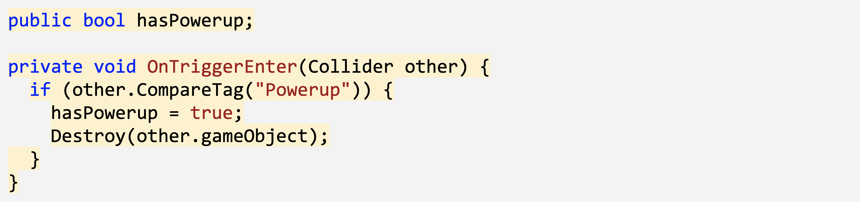 - Create a new public bool hasPowerup; and set hasPowerup = true; when you collide with the Powerup