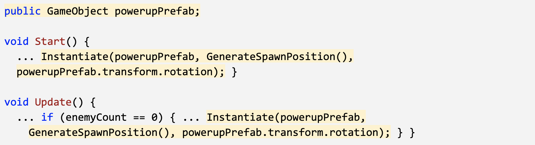 - Before the SpawnEnemyWave() call, Instantiate a new Powerup