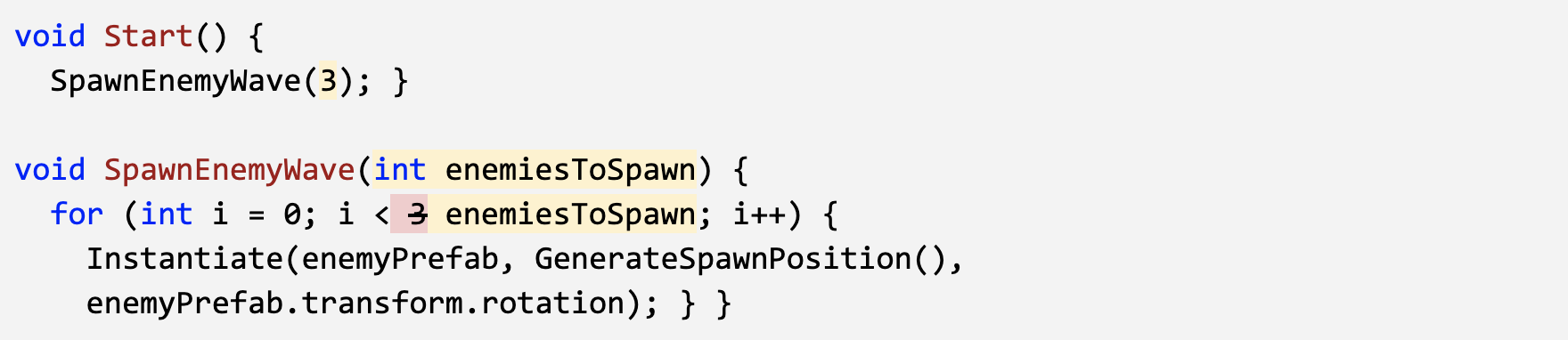 - Add a parameter int enemiesToSpawn to the SpawnEnemyWave function