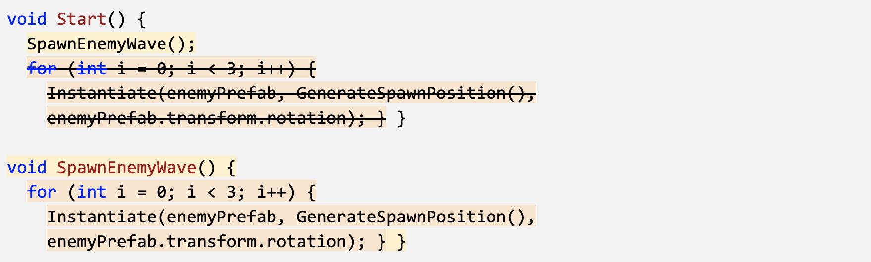 - Move the for-loop to a new void SpawnEnemyWave() function, then call that function from Start()