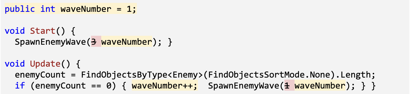 - Declare a new public int waveNumber = 1;, then implement it in SpawnEnemyWave(waveNumber);