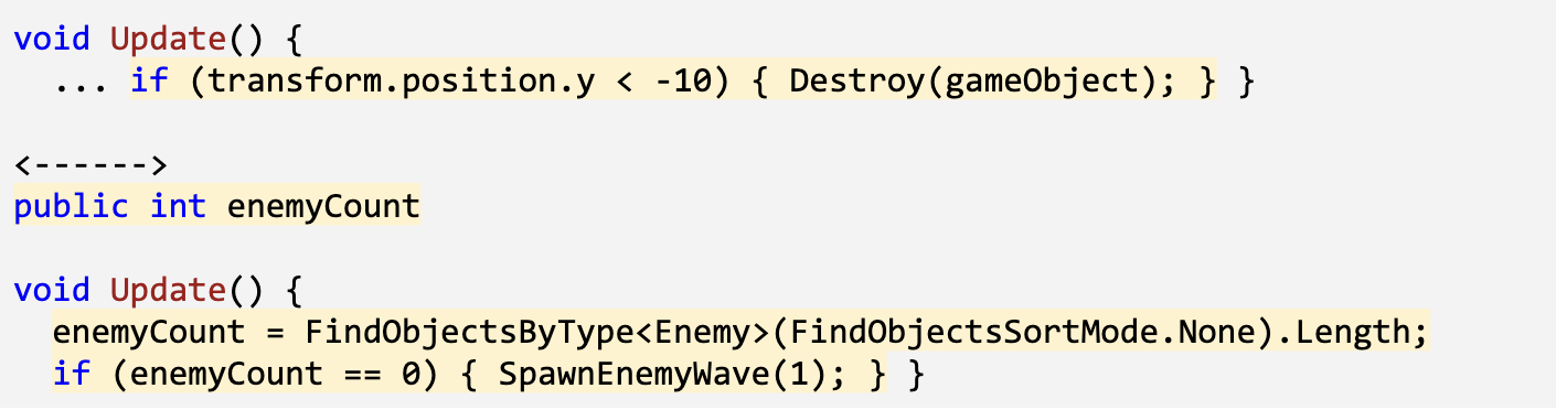 - In Update(), set enemyCount = FindObjectsByType<Enemy>(FindObjectsSortMode.None).Length;