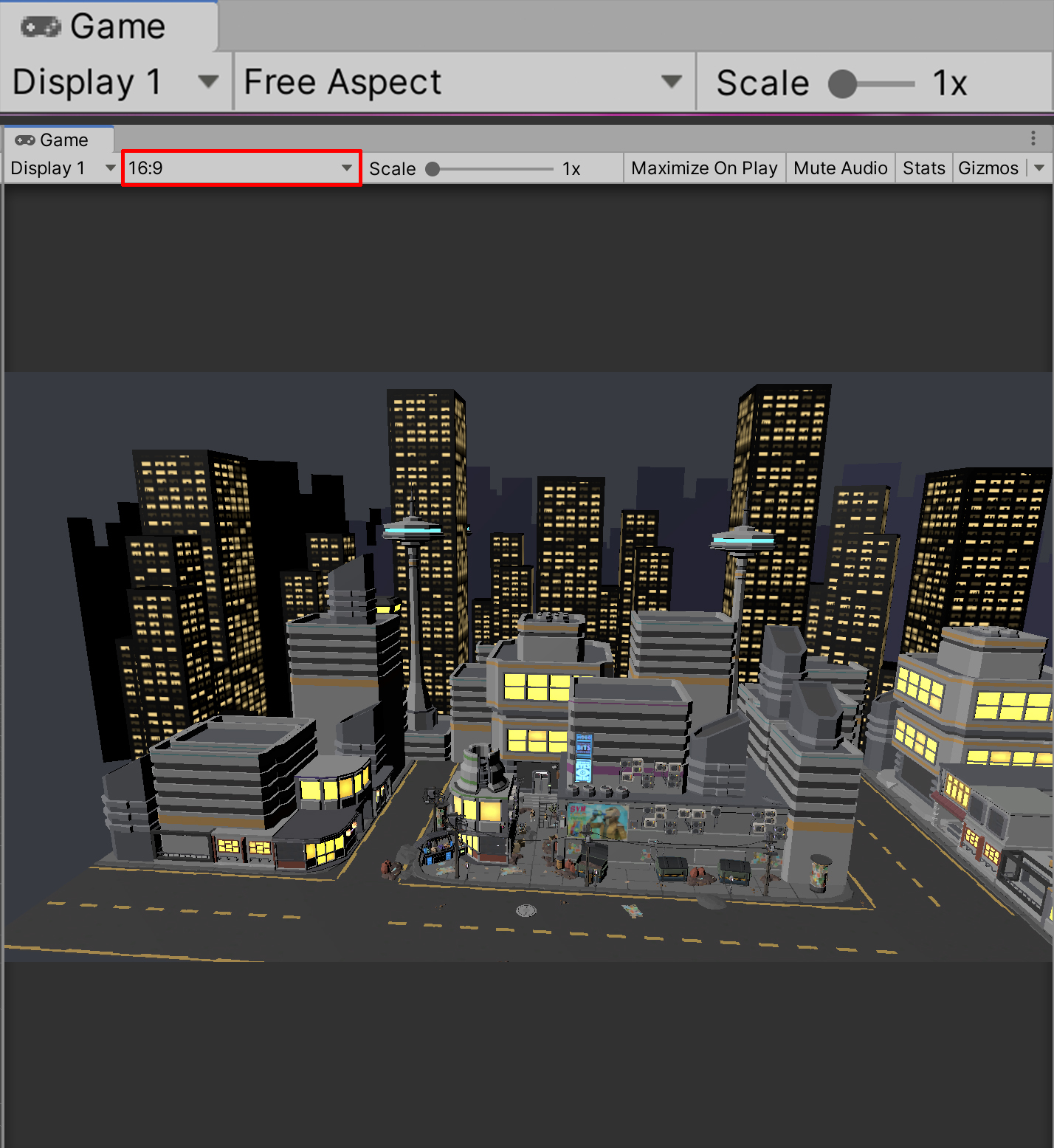 3. In the Game window, select the drop-down menu labelled to the right of the Display button, and set the Aspect Ratio to 16:9. The default setting of the Game window’s view to Free Aspect will set the Main Camera’s view to match the size of your Game window.