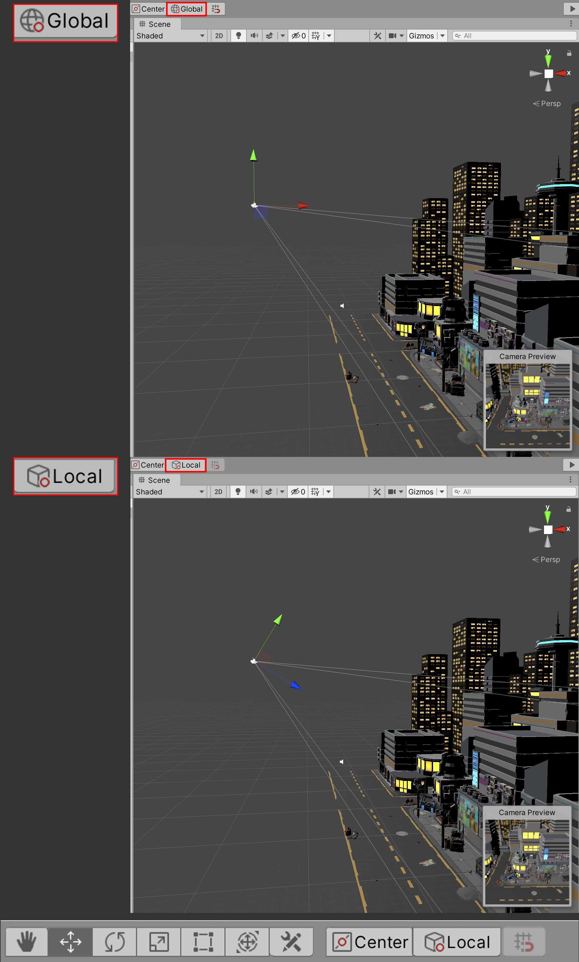 6. In the Toolbar in the upper-left corner of the Editor window, change the Toggle Handles (the red, green and blue gizmos visible in Scene View) from Global to Local (Figure 02).