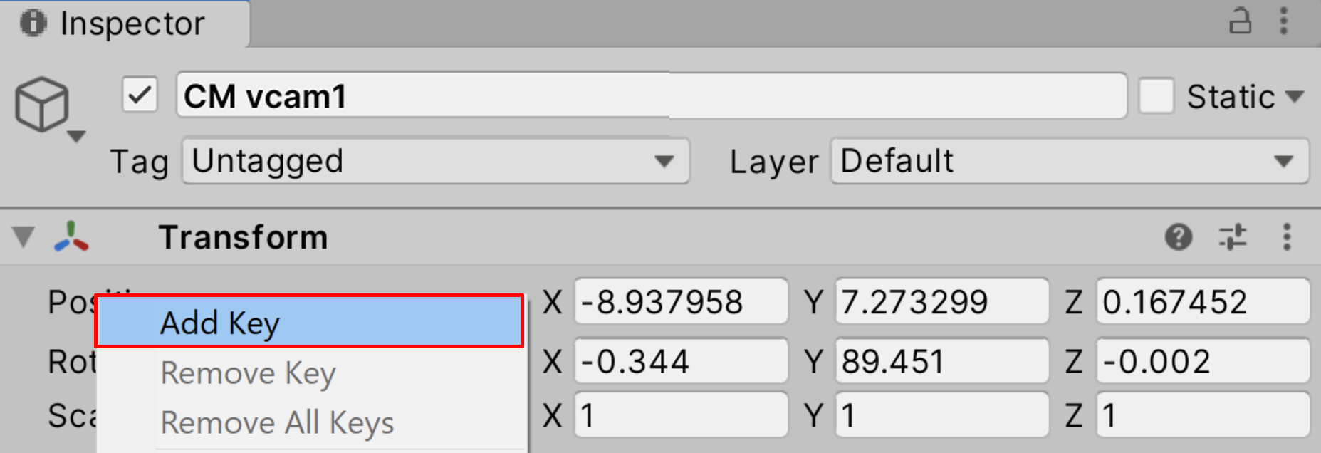 1. Set the Timeline's playhead to Frame 0, then select the red Record button on the Virtual Camera CM vcam1 Animation Track. In the Inspector, right-click under the Transform component and select Add Key to create our first keyframe (Figure 14).