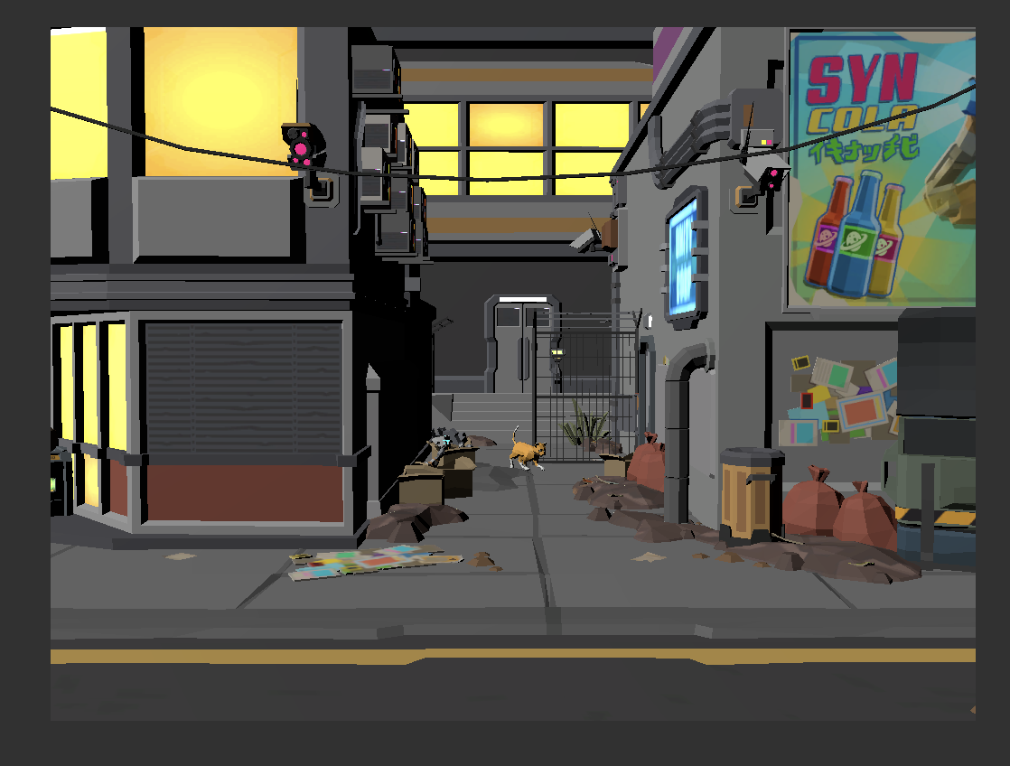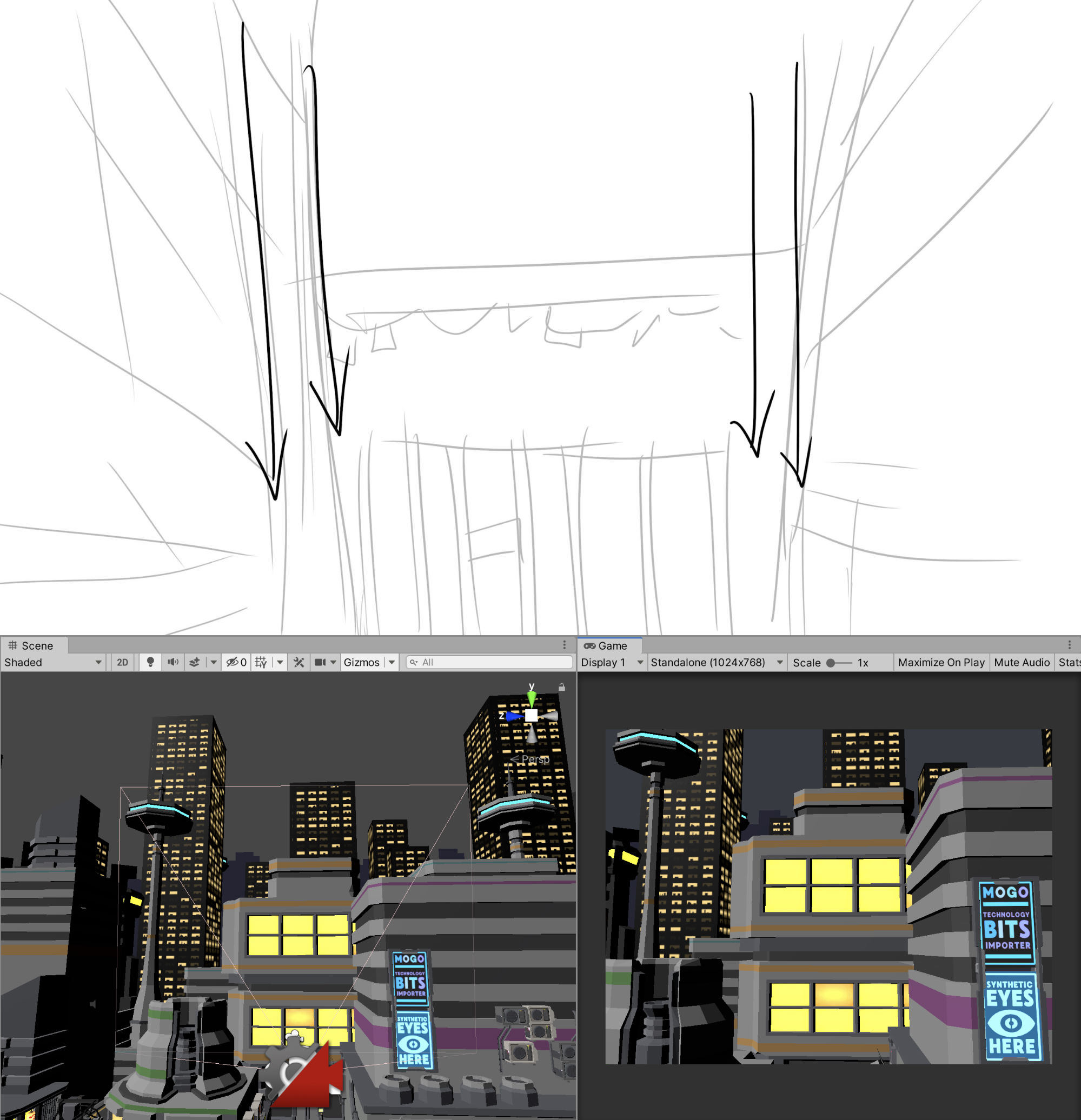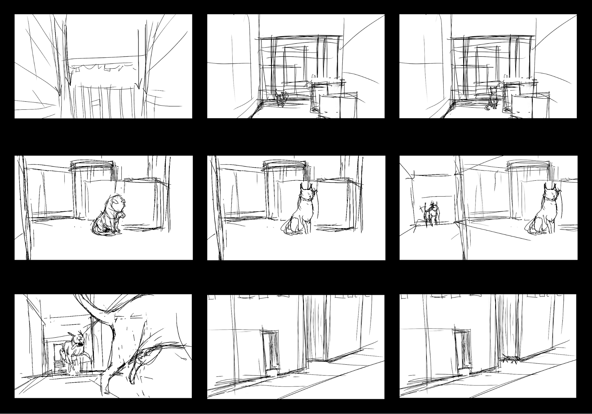 We are ready to frame our first shot. This shot, as it appears in the storyboards, is an establishing shot that sets the tone for the Scene while showing off its key players: the city skyline, the cat, and the dog.