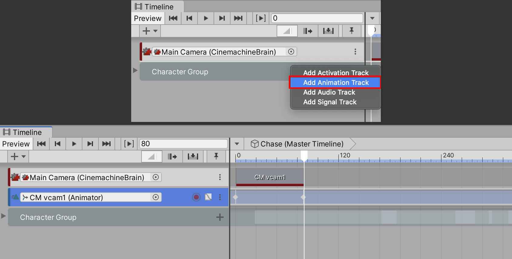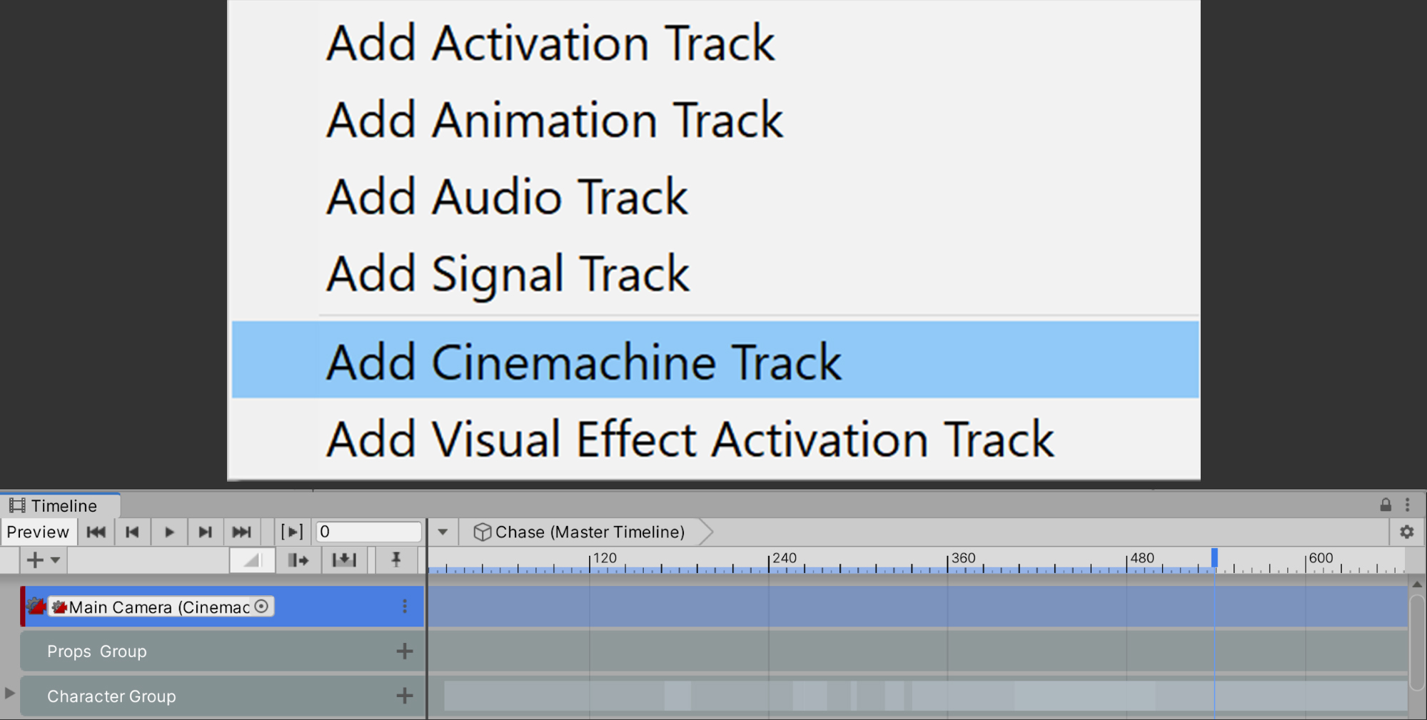 2. Drag and drop the Virtual Camera onto the left panel of the Timeline, just below the Main Camera (CinemachineBrain) Track. When prompted, select Add Animation Track from the context menu (Figure 12).