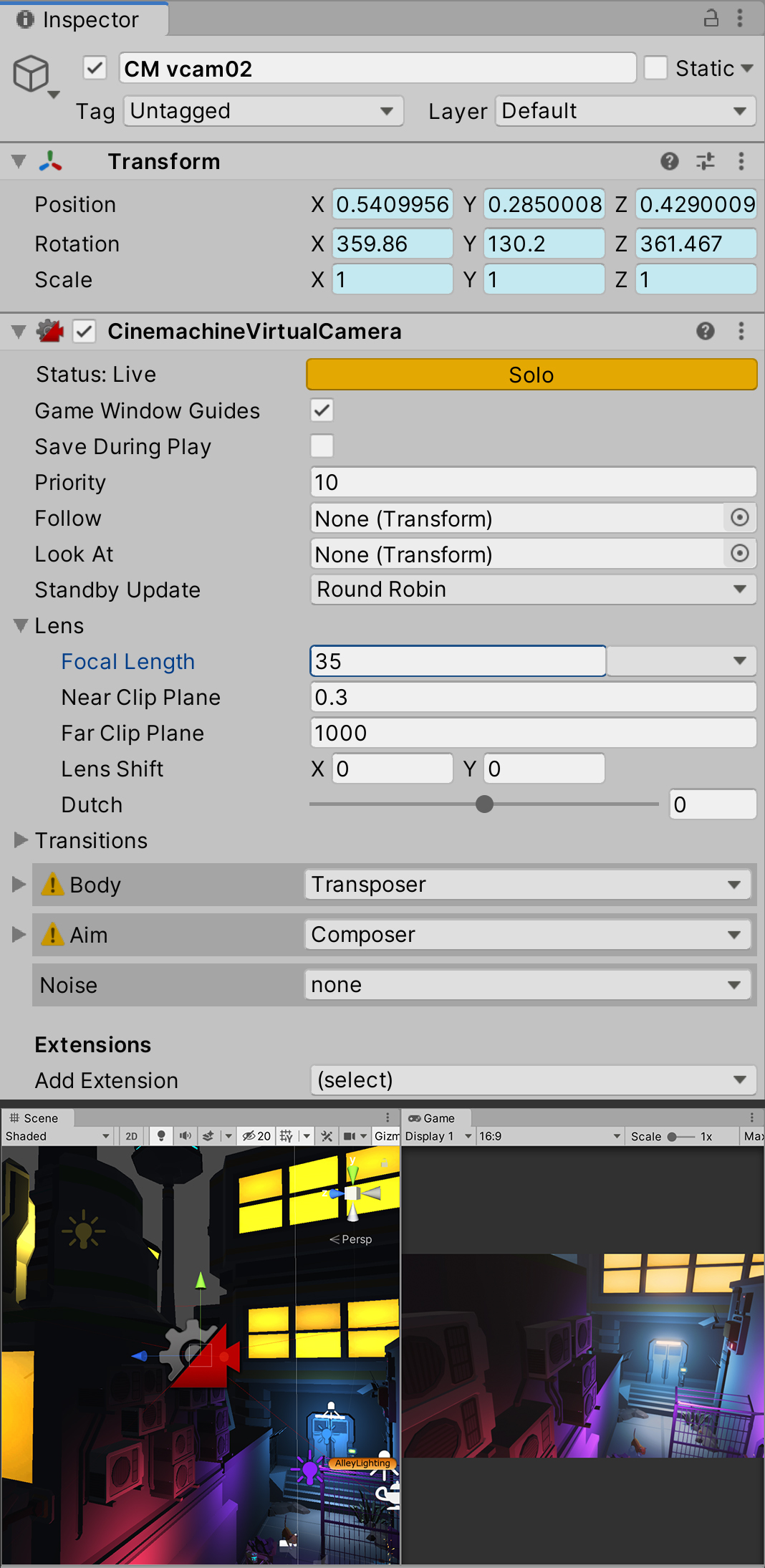 3. In the Inspector, click the Solo button. This allows us to see through the Virtual Camera in the Game view (Figure 09).