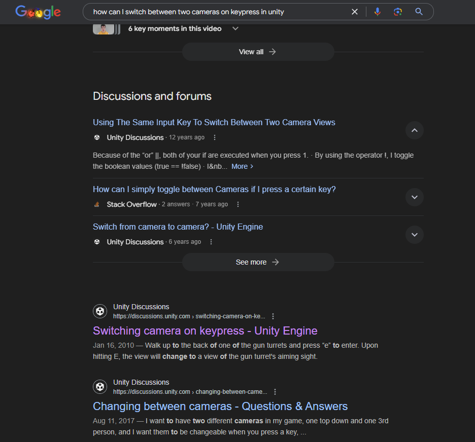 When searching through a search engine, you’ll often find valuable discussions on Unity Discussions. Below is an example of a search and the results provided by the search engine.