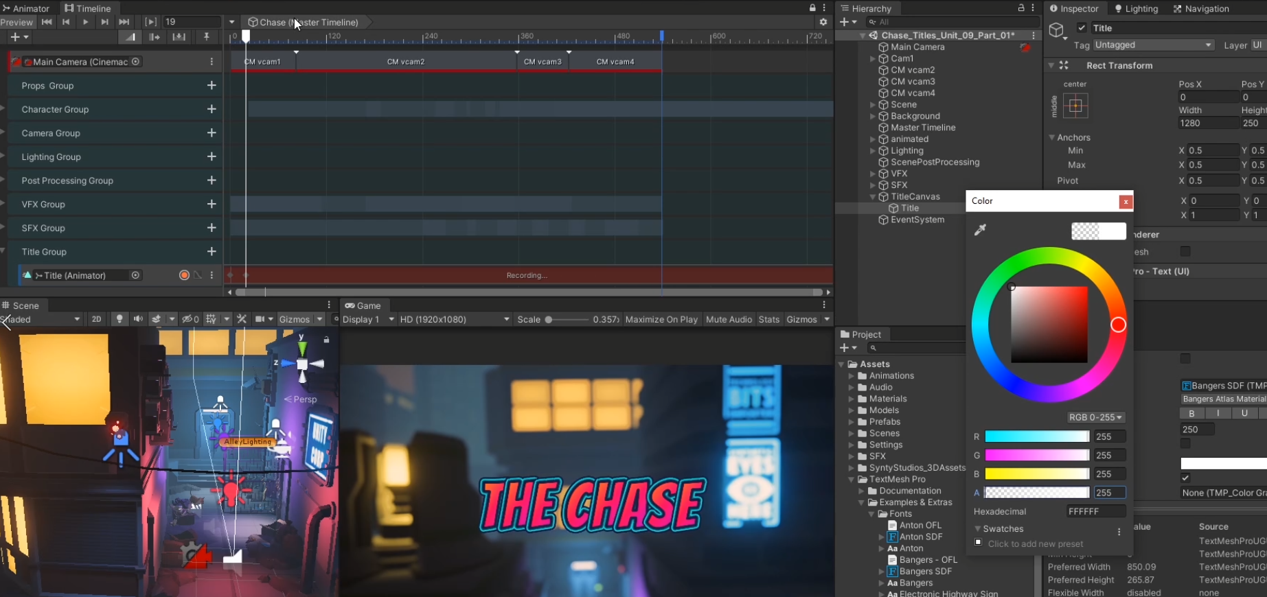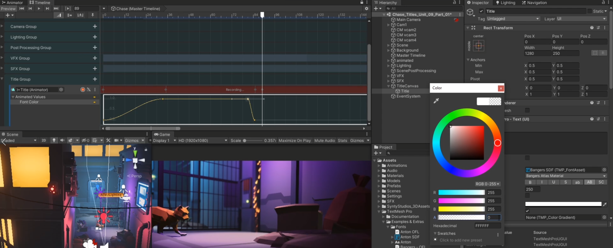 6. With the Timeline playhead cursor set to Frame 0, ensure that the "Title" GameObject is selected in the Hierarchy window. Next, select the Vertex Color in the Inspector window, within the TextMeshPro - Text (UI) component (Figure 28).