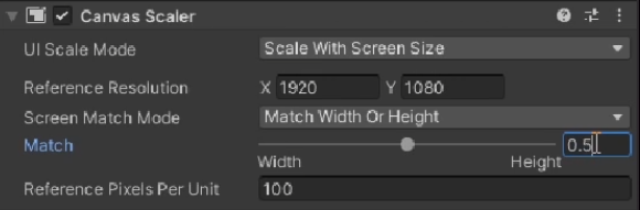 5. Change the Reference Resolution under Canvas Scaler to X: 1920 Y: 1080 and change the Match value to 0.5 (Figure 12) so that our title remains centered, proportionate to our screen resolution.