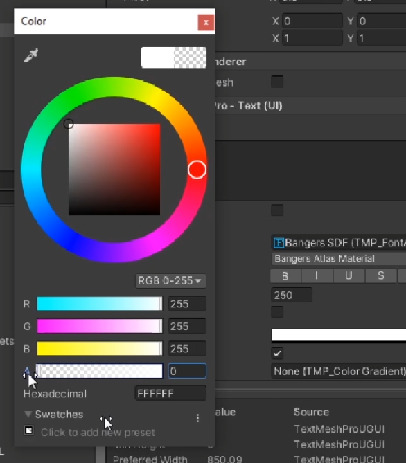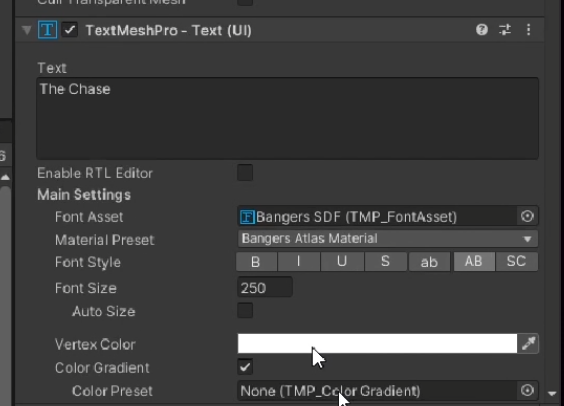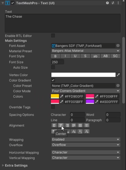 • You can either have one colour for your font by changing Vertex Color, or you can use a gradient by enabling Color Gradient. Enable this checkbox and made the first color “#FFD900FF,” the second color “#FF006FFF,” the third color “#FF005BFF,” and the fourth color “#A500FFFF.”