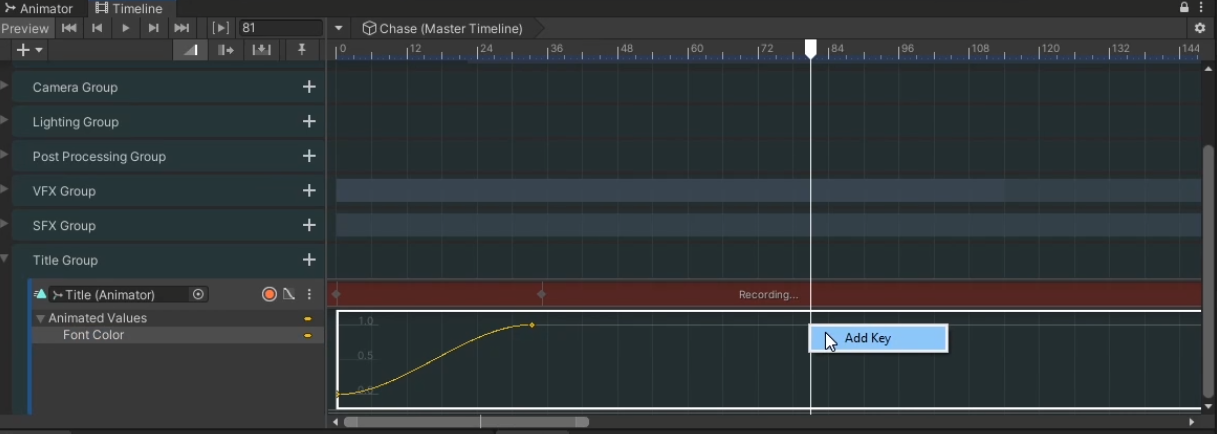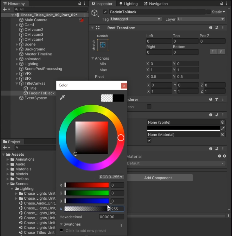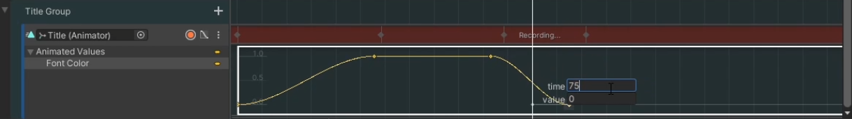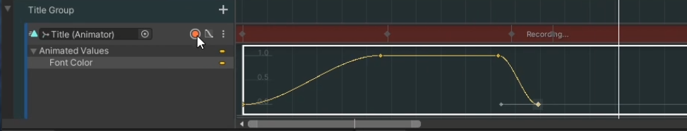 7. Press the record button to animate the FadeInToBlack GameObject’s opacity.