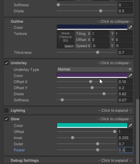 • Underlay is the innermost border element. Enable the Underlay checkbox, and then select the Underlay field again to expand its properties. Change Underlay Color to Purple (make sure the Alpha in the Color settings is set to 255), Offset X to 0.15, the Offset Y to 0.2, the Dilate value to 0.62, and the Softness value to 0.07.