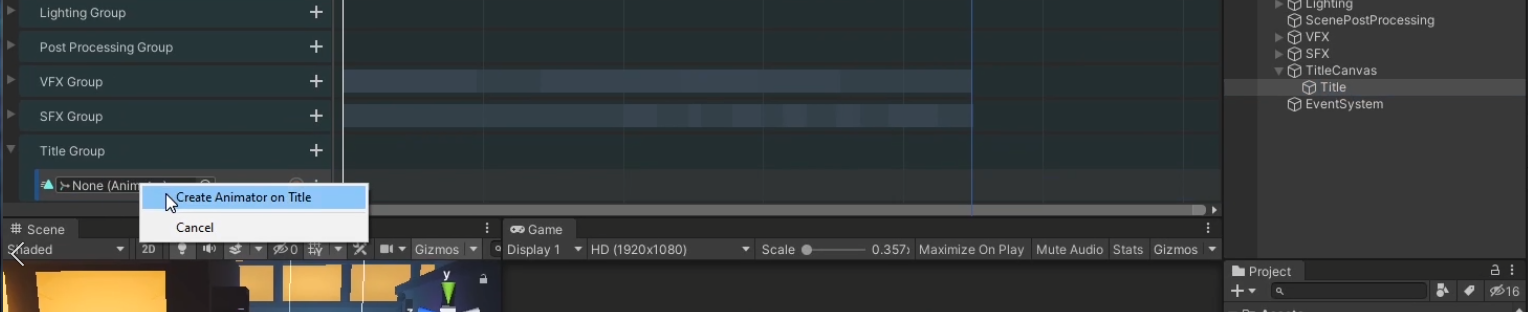 4. Drag your “Title” GameObject in your Hierarchy to the empty animation track and click Create Animator on Title (Figure 26).