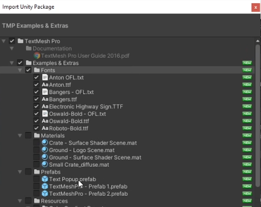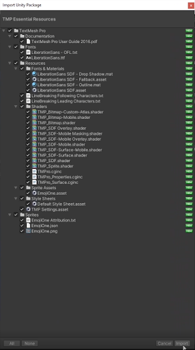 TextMesh Pro is a package capable of creating stylish text in Unity. Import the TextMesh Pro essential resources and fonts into your project.