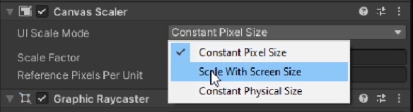 • Make sure TitleCanvas is selected. In the Inspector under Canvas Scaler, change the UI Scale Mode from Constant Pixel Size to Scale With Screen Size (Figure 11) in order to keep the title proportionate to the 16:9 aspect ratio.