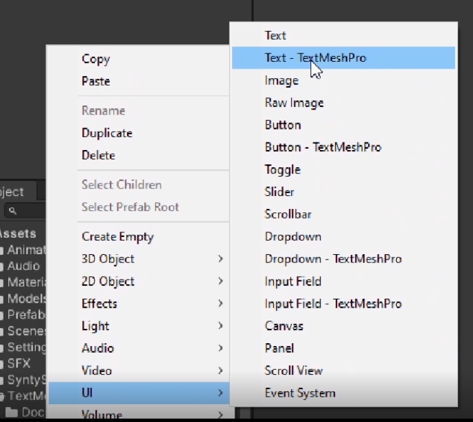 3. Right click in the Hierarchy and navigate to UI > Text - TextMeshPro (Figure 08) to create a new TextMesh Pro GameObject in your scene.
