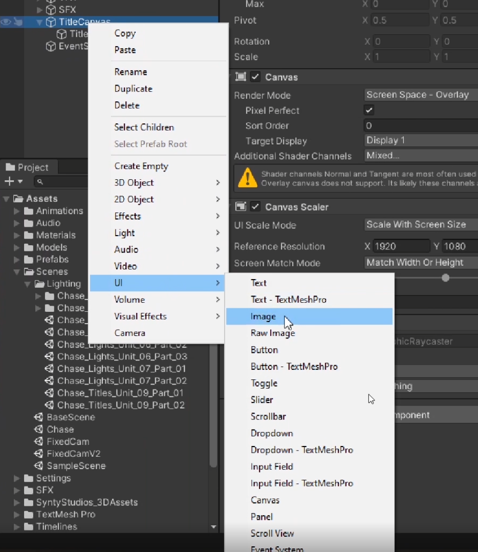 1. In the Hierarchy, right click on the TitleCanvas and select UI > Image (Figure 39).