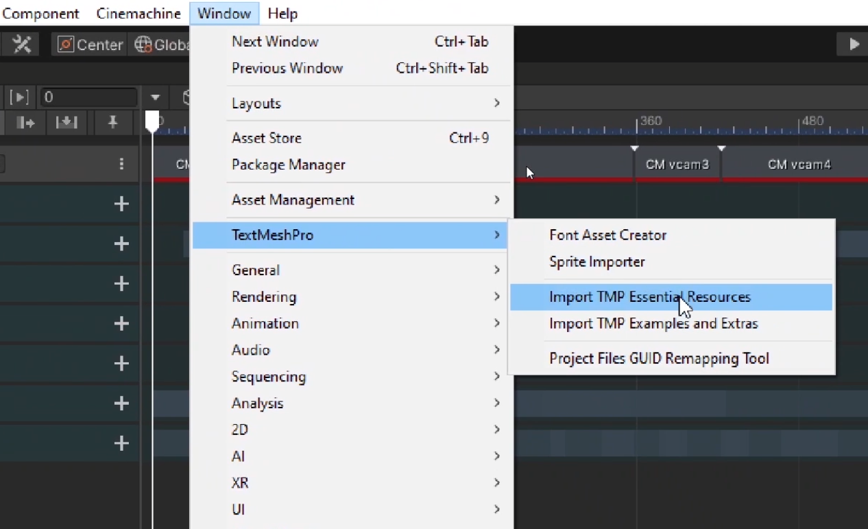 1. From the top menu dropdown, select: Window > Text Mesh Pro > Import TMP Essential Resources (Figure 01).