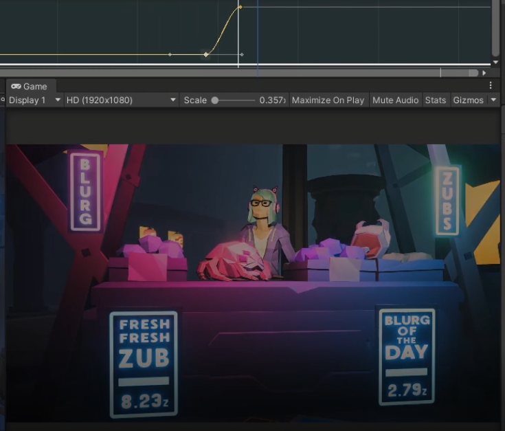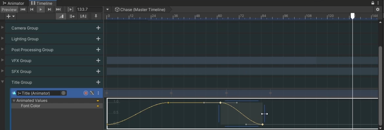 d. Create one final frame at 515 frames and set the FadeInToBlack’s alpha value to 255. The fade out should look something like this on the graph editor (Figure 48). Feel free to tweak these values depending on how drastic of a fade in and fade out you want.
