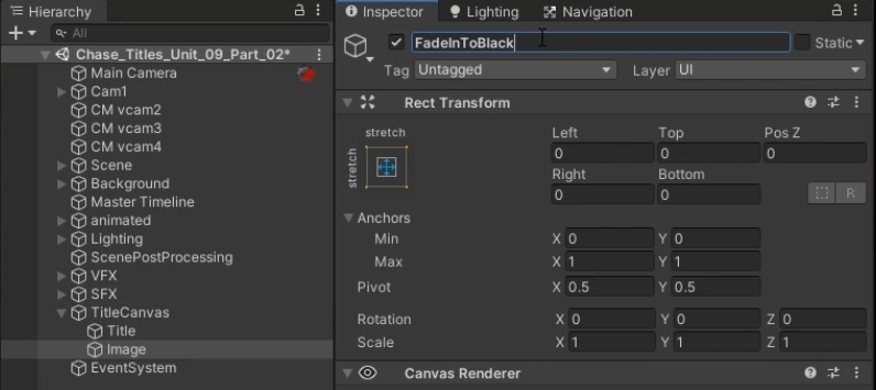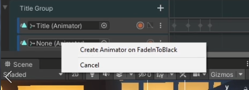 6. Drag FadeInToBlack onto the empty Animation Track and select Create Animator on FadeInToBlack (Figure 46).