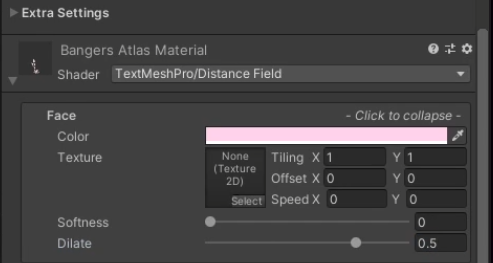11. In the Inspector, below Extra Settings, expand the triangle for Bangers Atlas Material, and then in the setting labelled Face, change Color to light pink and change the Dilate value to 0.5 (Figure 20). Doing this will make the title appear fuller and get letters to overlap.