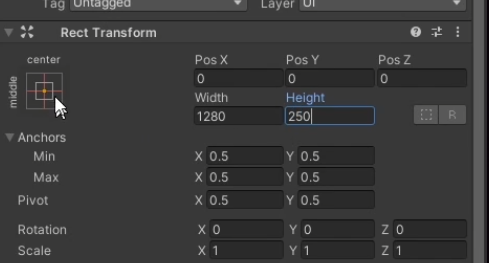 8. Under Rect Transform, change the Width to 1280 and the Height value to 250 (Figure 15) so that it evenly scales our title to a transform position on the screen. Additionally, change your X and Y position values to 0 in order to get our title where it needs to be on screen.