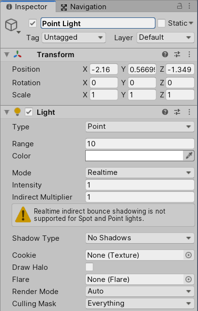 • Mode: This allows you to specify the Light Mode to determine if and how a light is baked. The possible modes are Realtime, Mixed, and Baked.