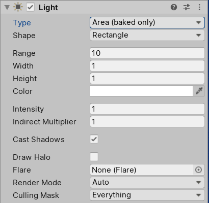 - Type: This shows the current type of light being used. Possible values are Spot, Directional, Point, and Area (Baked only).