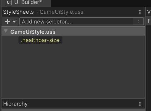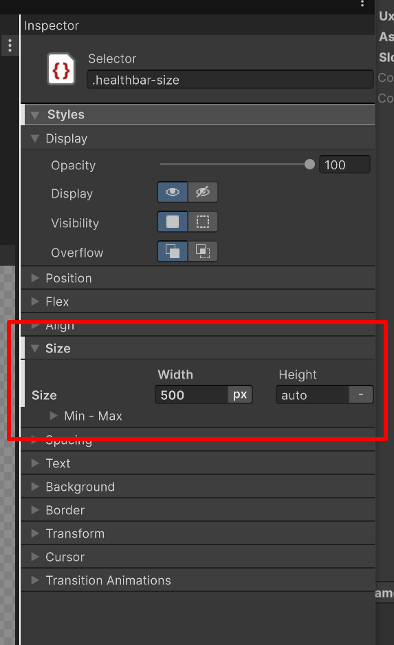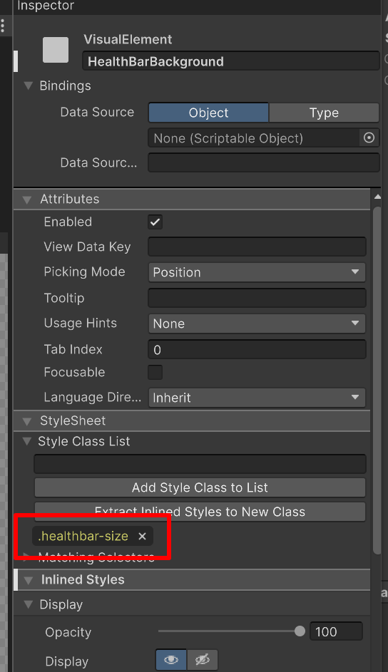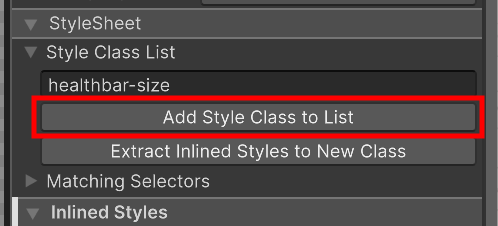 Finally, if you select your HealthBarBackground element, in the Stylesheet section in the Inspector window, you will see that the healthbar-size class is applied to it.