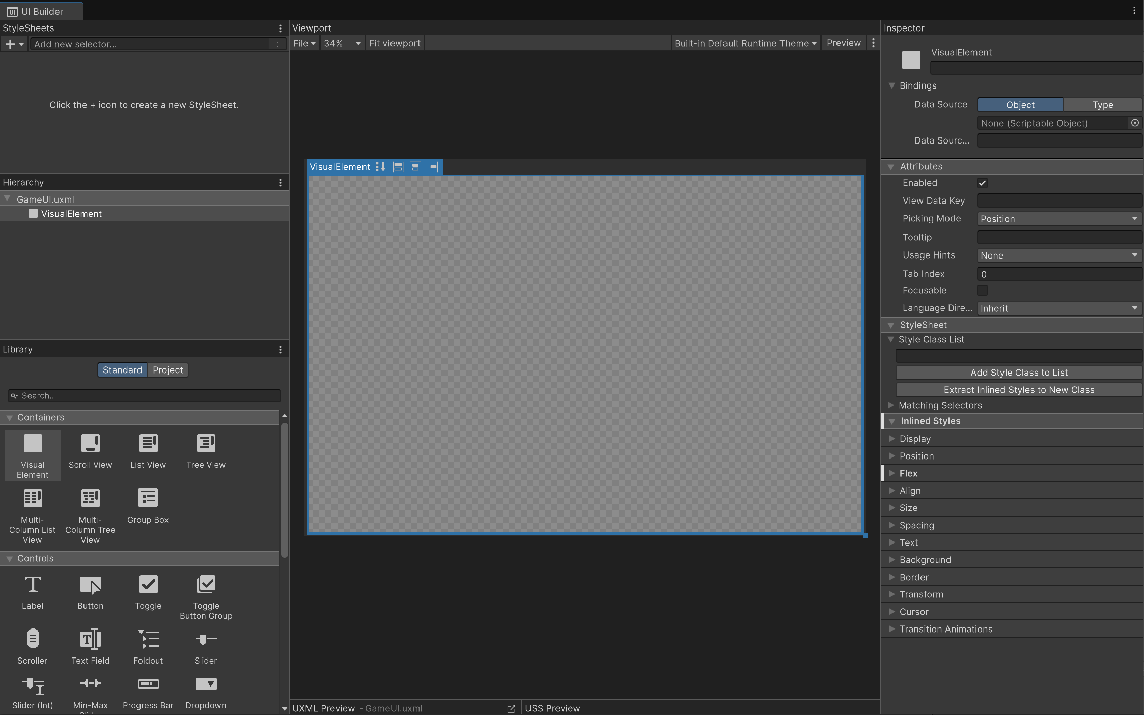 In this tutorial, you’ll use UI Builder to create and style elements directly. However, you’ll also learn how to use a USS file to define styling.