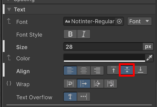 4. Use the foldouts (triangles) to expand the Inlined Styles > Text section and set the Align property to middle and change the Size to 28.