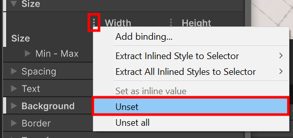 6. Select the the select the Width property’s More (⋮) menu in the Size section, and select Unset.