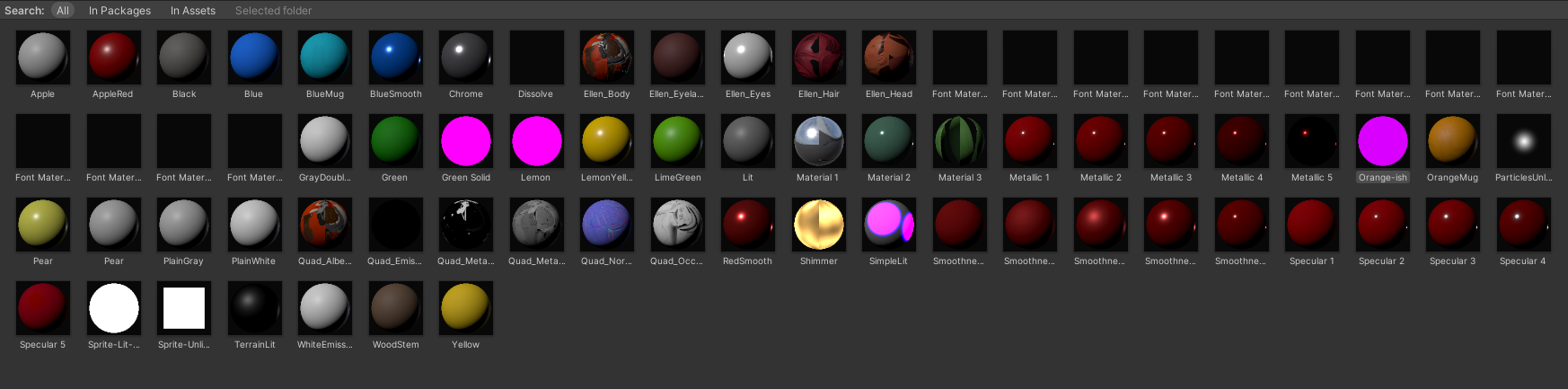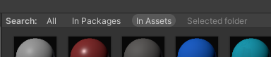 You can select the options at the top of the Project window to narrow your search to materials In Packages, In Assets (your Assets folder), or in a selected folder. To see only the materials in the project, select In Assets.