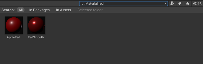 In the search bar of the Project window, add “red” to your search, making the query t:Material red, to find all materials with “red” in their names.