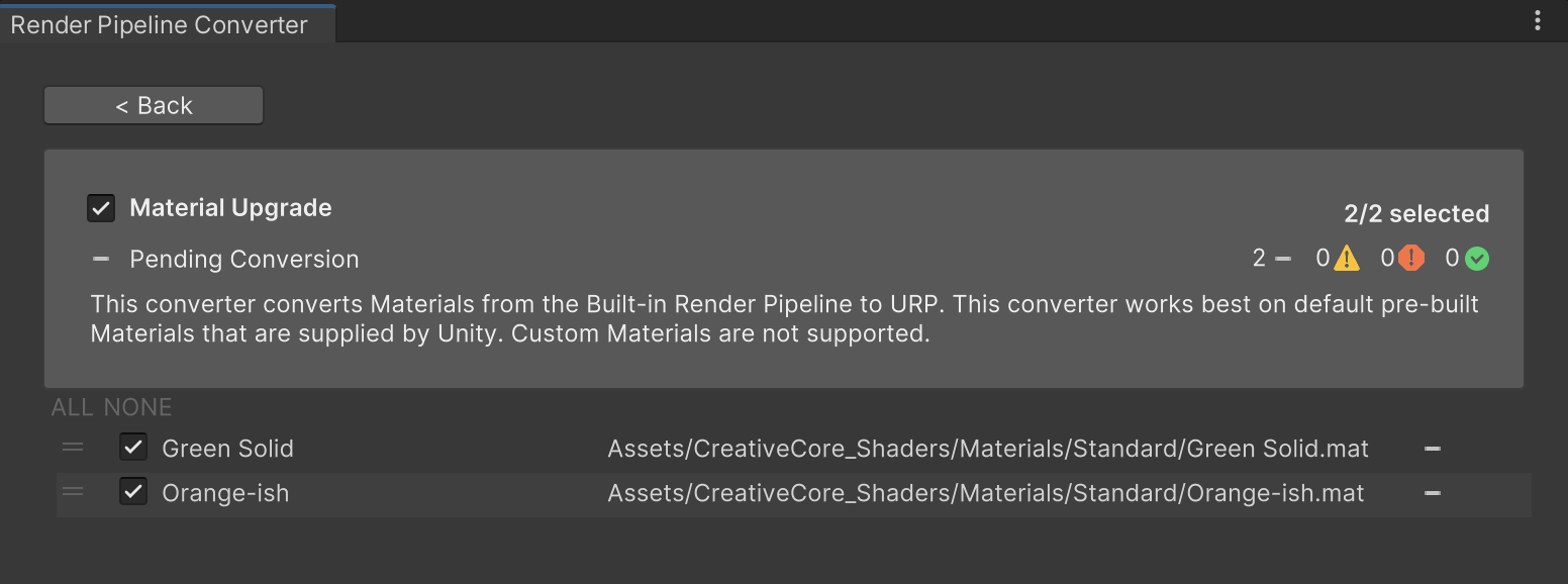 Tip: You can also upgrade a single material. Select the material in the Project window, and then go to the main menu and select Edit > Rendering > Materials > Convert Selected Built-in Materials to URP.