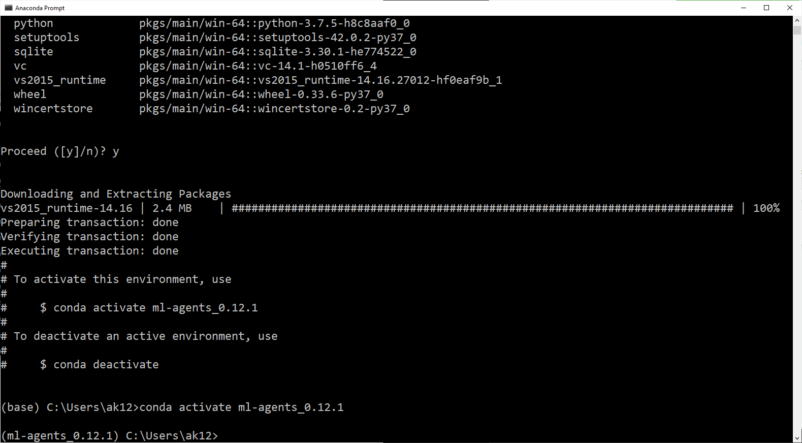 When the installation is complete, follow the Verifying your installation: Anaconda instructions. These instructions will teach you how to launch the Anaconda prompt on your operating system. This prompt is what we will use to run training in a later tutorial.