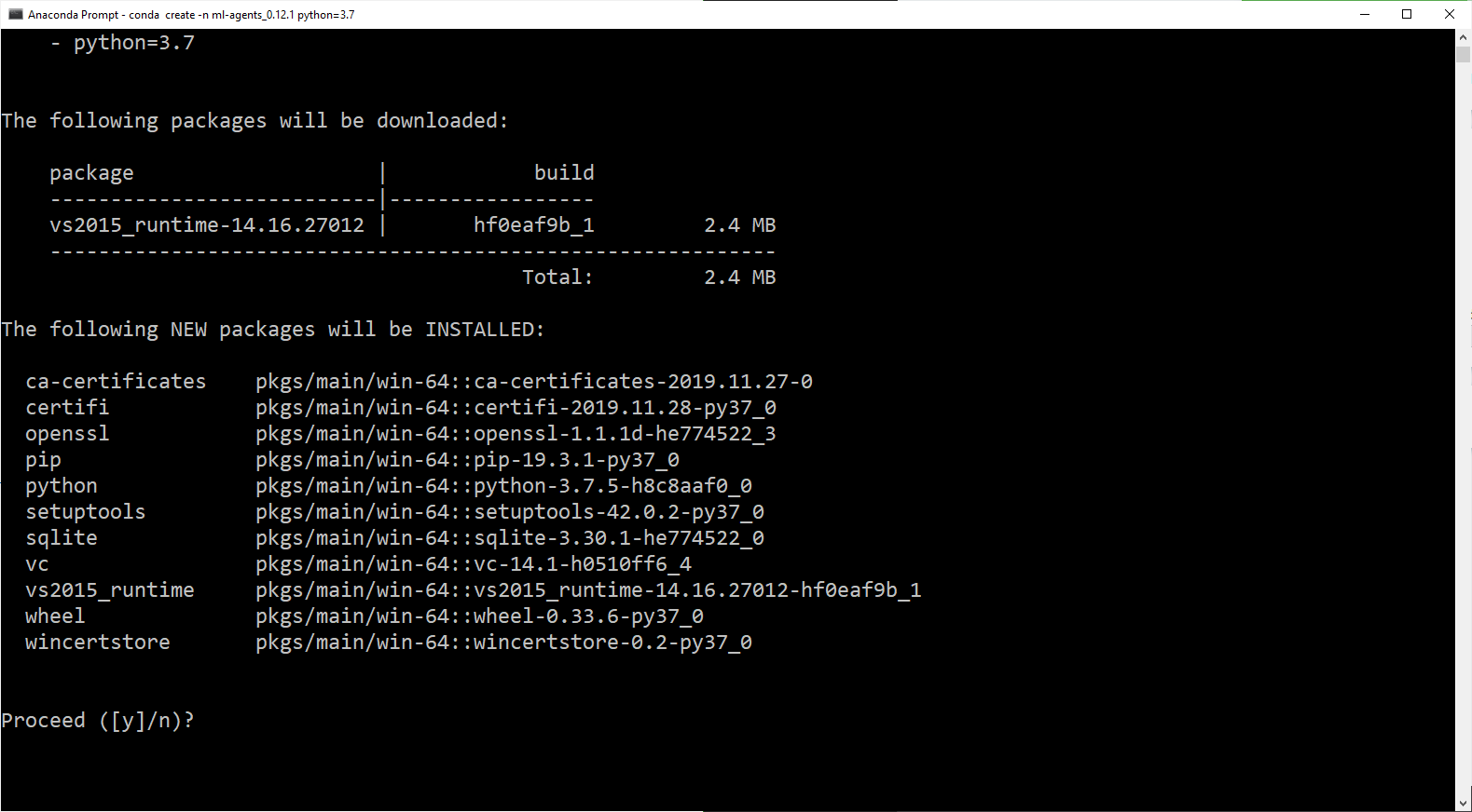 conda create -n ml-agents python=3.7This command will create a new Python 3.7 environment called ml-agents. You may rename it if you want. For example, you might already have an environment called ml-agents from a previous version, so you could call this environment ml-agents_0.13.0.