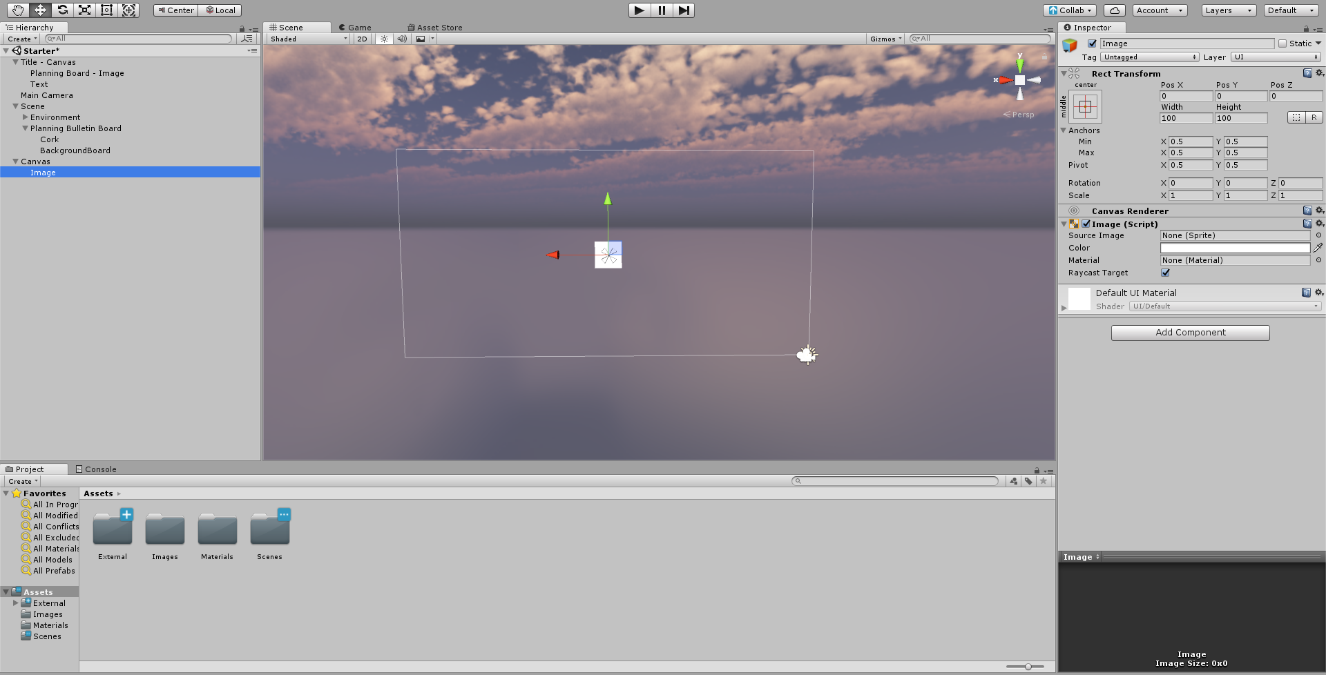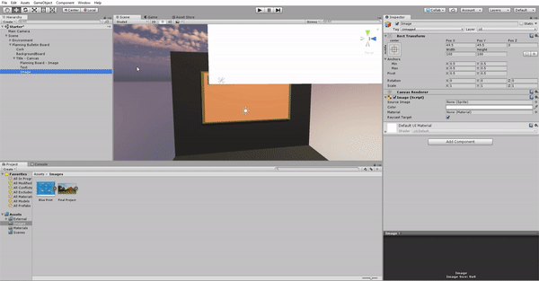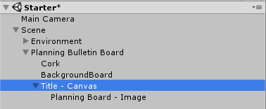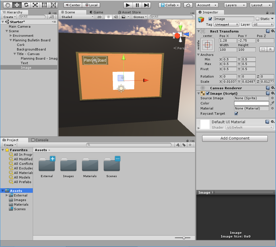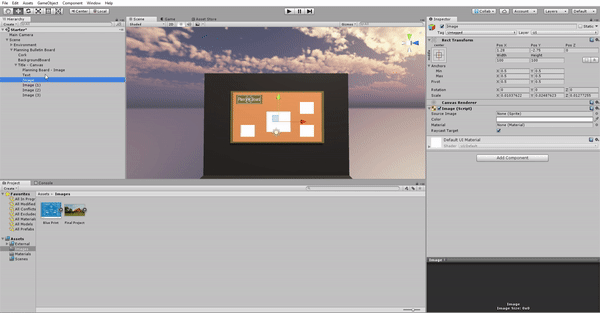 1. Create an Image as a child of the Planning Bulletin Board GameObject by right-clicking it in the Hierarchy and navigating to/clicking Create > UI > Image or Right Click > UI > Image. This automatically generates a parent Canvas.